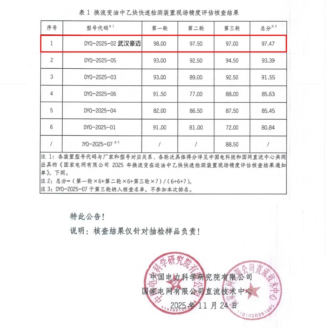 2025年度换流变在运油中乙炔快速检测装置现场精度评估荣获总分第一